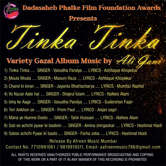हाल ही में अशफाक खोपेकर और सिंगर वसुधा पांड्या ने एक खूबसूरत ग़ज़ल अल्बम “तिनका तिनका” जारी किया है। दादा साहब फाल्के फिल्म फाउंडेशन ने इस एल्बम में नए सिंगर्स को सुनहरा अवसर दिया है।