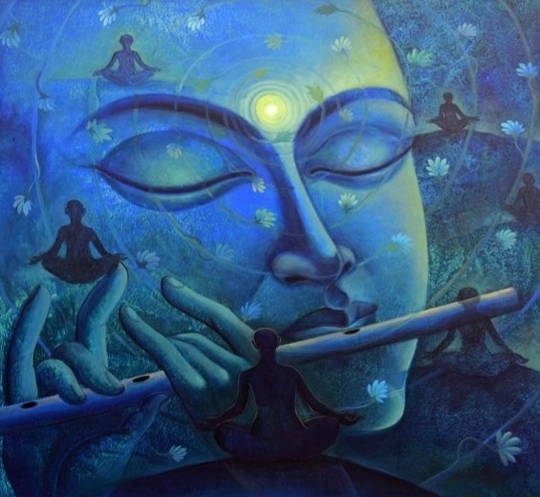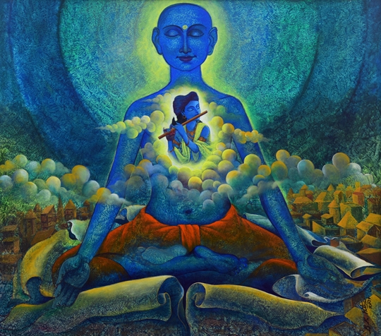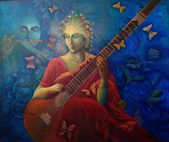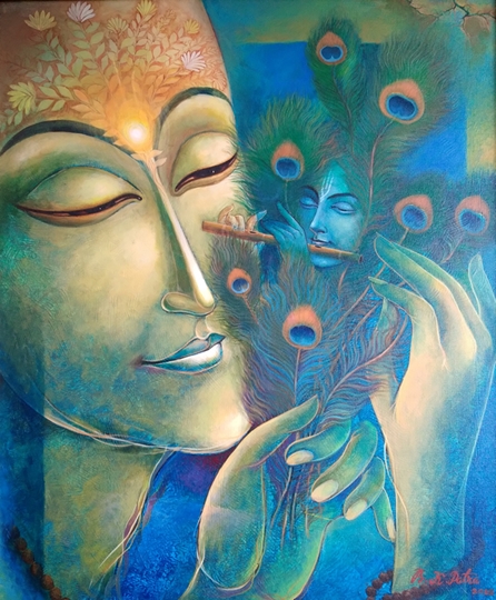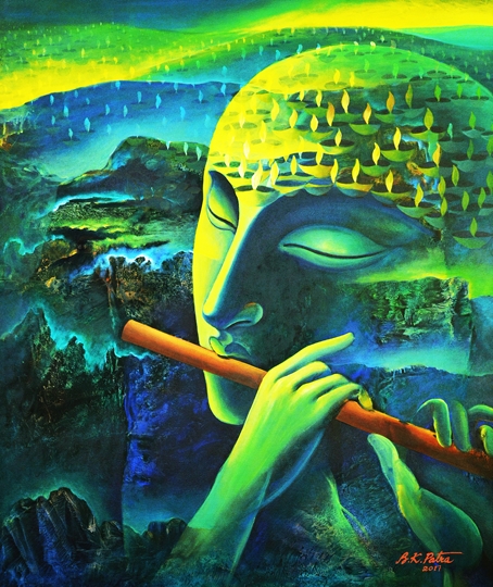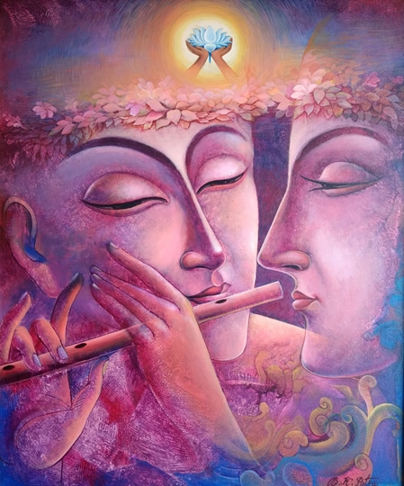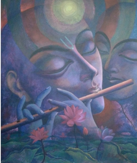 The present series of artwork in acrylic colours on canvas illustrates subtle nuances of FASCINATING DEVOTION in his unique style of visual expressions. His unique expressive thematic endeavours reveal the conceptualization on divine path through music of spirituality and rhythm of music. It is most effectively revealed through his artistic exploration of the beauty and reality of Universal metaphor in human soul, mind and heart. These divine sentiments are depicted very artistically by Bir Kishor Patra via vivid interactive and expressive emotional experiences which have duly inspired him to vividly portray the spiritual Universe connected and closely related with Divine Music which, in turn, showers its eternal elixir and nectar on the entire mankind. The artistic expressions in various works symbolize the divine journey from outer world to inner subconscious mind which is based on spiritual experience of Divine Gurus, Saints etc. as has been derived from Universal truth of realisation of self.